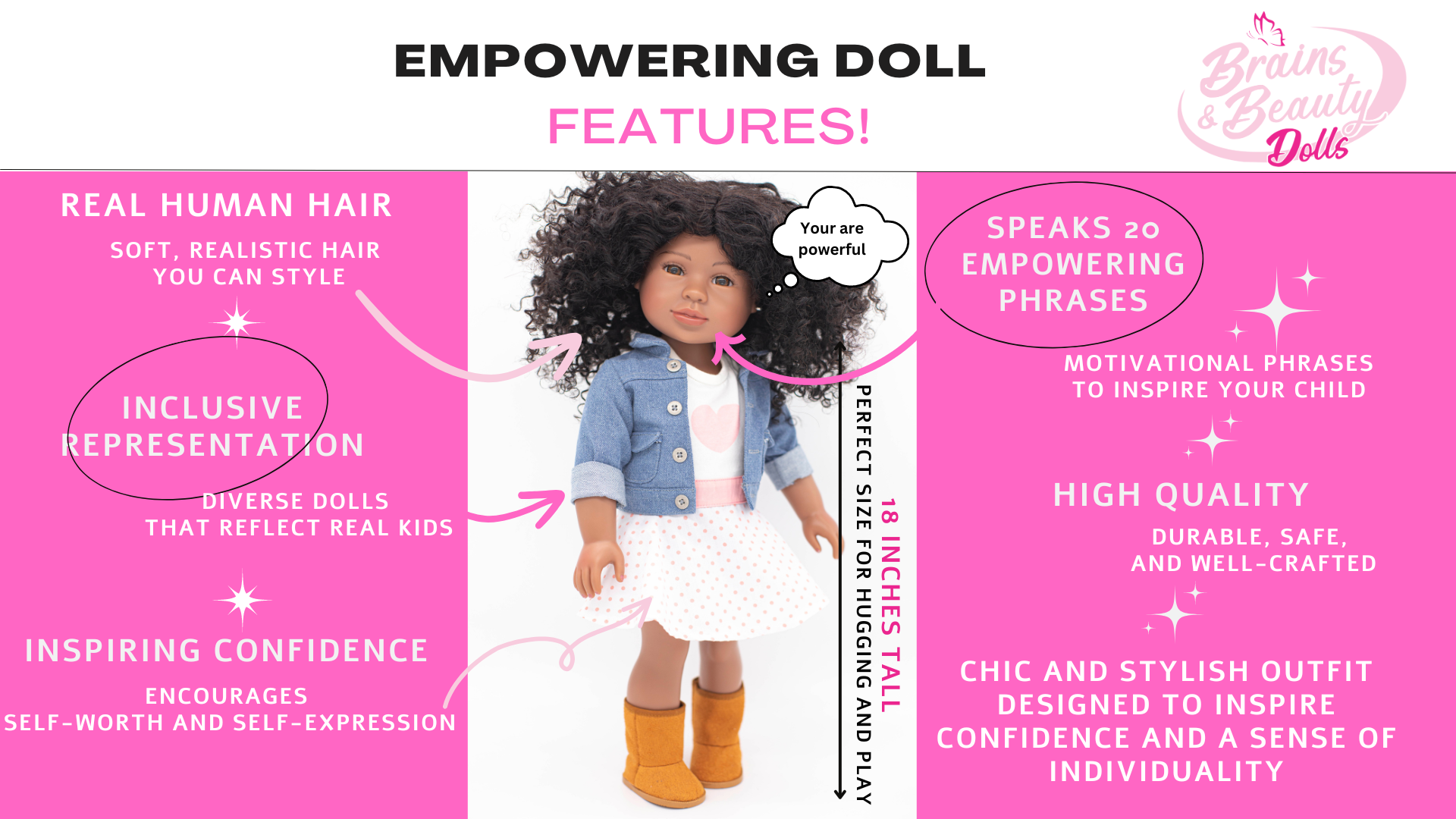 More than just toys, Brains & Beauty Dolls are role models—designed to nurture self-awareness, self-esteem, and a strong sense of identity.